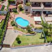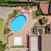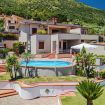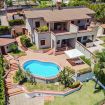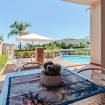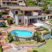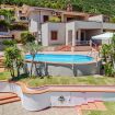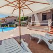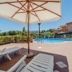Una piscina privata con sdraio e ombrelloni, perfetta per rilassarsi e godersi il sole